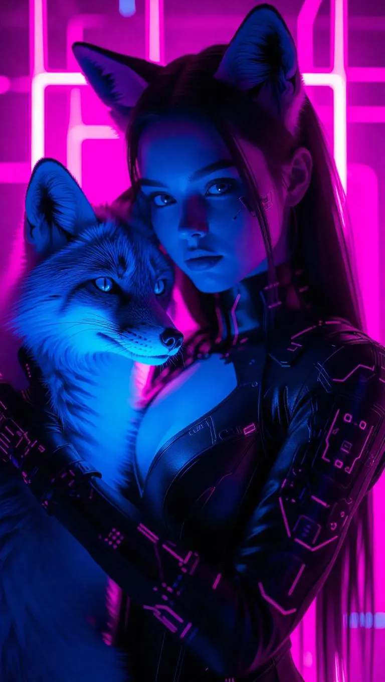 hdistyle, art illustration,1girl, android girl, holding a robotic fox, neon circuitry, deep cyber blue and purple lighting, futuristic pet bonding, holographic interface overlay masterpiece, best quality, amazing quality, very aesthetic, absurdres, detailed eyes, newest, pinkneoncybercore,
