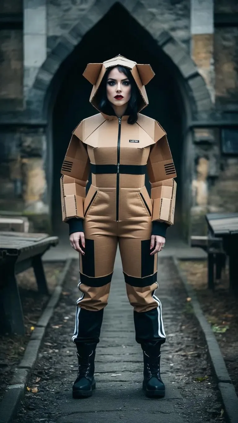 Generate edgy AI visuals of a Gothic woman in a DIY cardboard tracksuit with vivago.ai. Transform avant-garde fashion concepts into striking images using text prompts and AI effects, blending urban streetwear with sustainable materials for bold, unconventional style statements.