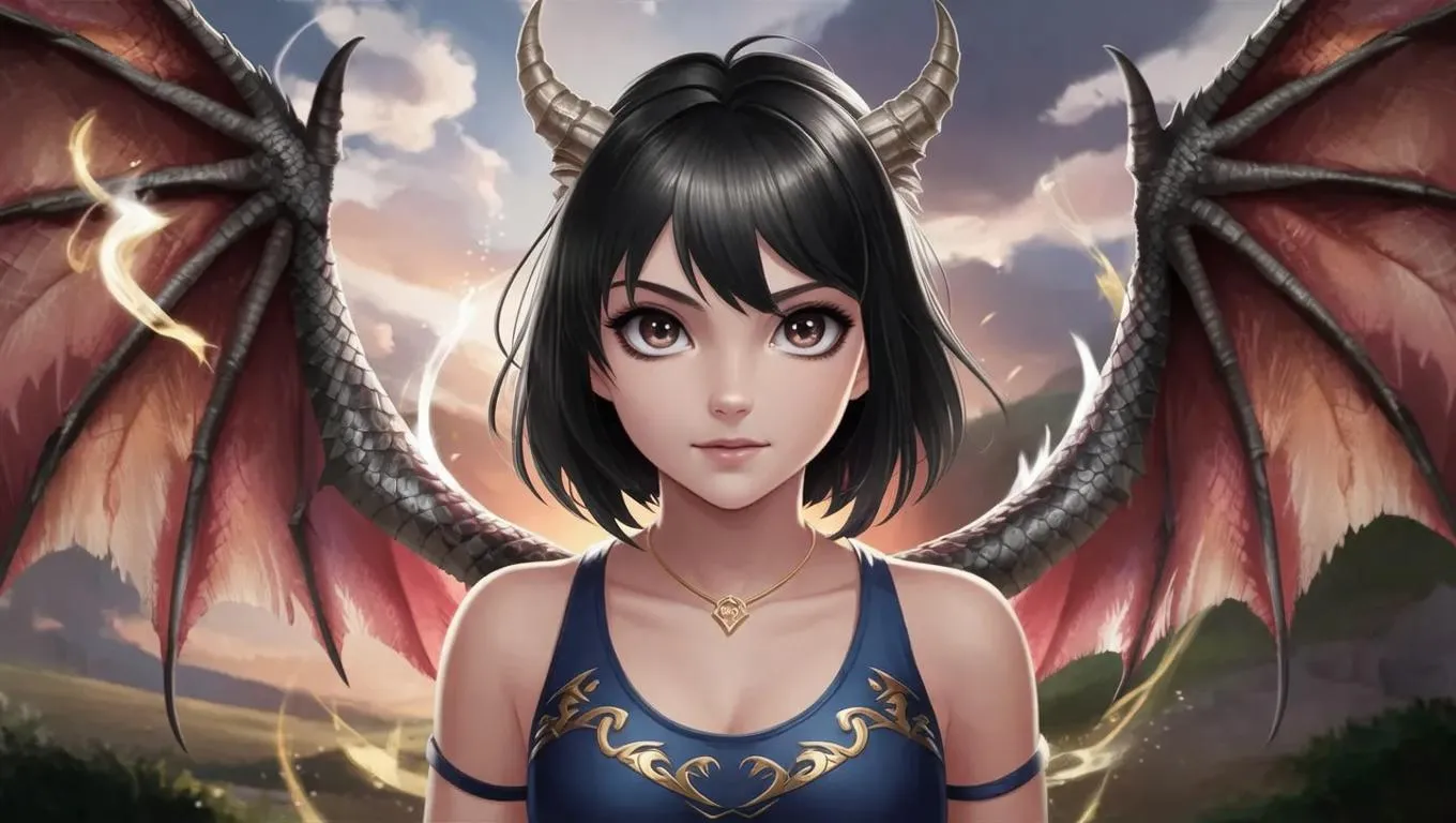 Create stunning AI-generated anime art of a 16-year-old girl with dragon powers. Featuring black hair, brown eyes, slim build, light skin, dragon scales, and majestic wings. Transform text prompts into dynamic character designs with vivago.ai's advanced AI tools for professional-grade manga-style visuals. Unleash creativity effortlessly.