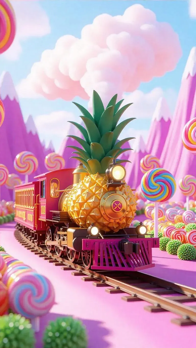 Generate a whimsical AI scene featuring a pineapple-shaped steam train releasing fruity-scented clouds, carrying delighted children through enchanted candy mountain landscapes. Unleash AI-powered creativity for magical storytelling and vibrant fantasy worlds. Perfect for unique digital art, children's book illustrations, and imaginative AI-generated content.