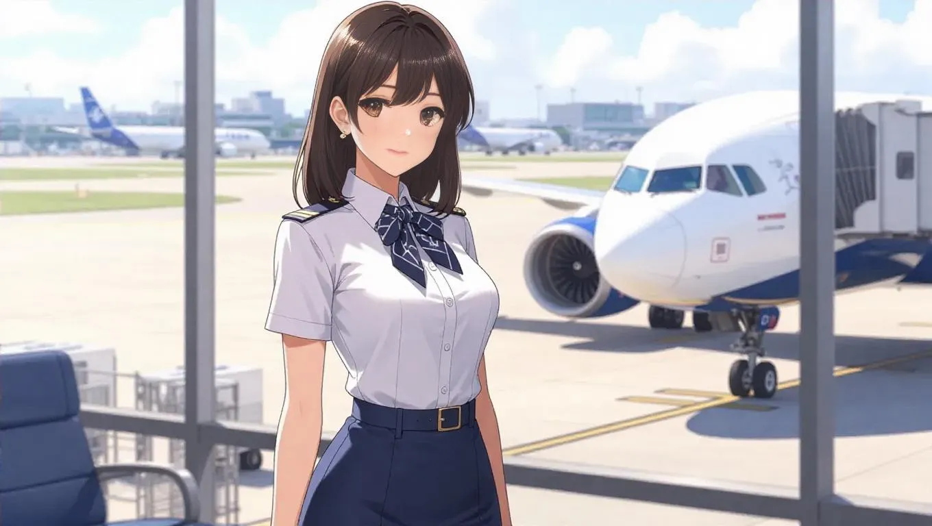 Vivago.ai generates AI-powered anime illustrations blending traditional Japanese aesthetics with modern elegance. Create a professional flight attendant in a detailed airport scene: white blouse, navy skirt, patterned scarf, soft sunlight, and vibrant colors. Realistic clothing textures, lively background with passengers, and a friendly expression convey sophistication. Perfect for dynamic, culturally rich visuals with smooth lines and professional ambiance.