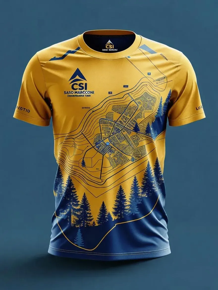 Design a custom running t-shirt for CSI Sasso Marconi orienteering team with vivid yellow base, blue tree accents, and a bold front logo. Features a dynamic AI-generated map illustration on the back for team spirit. Perfect sportswear blending creativity, functionality, and identity for outdoor adventures.