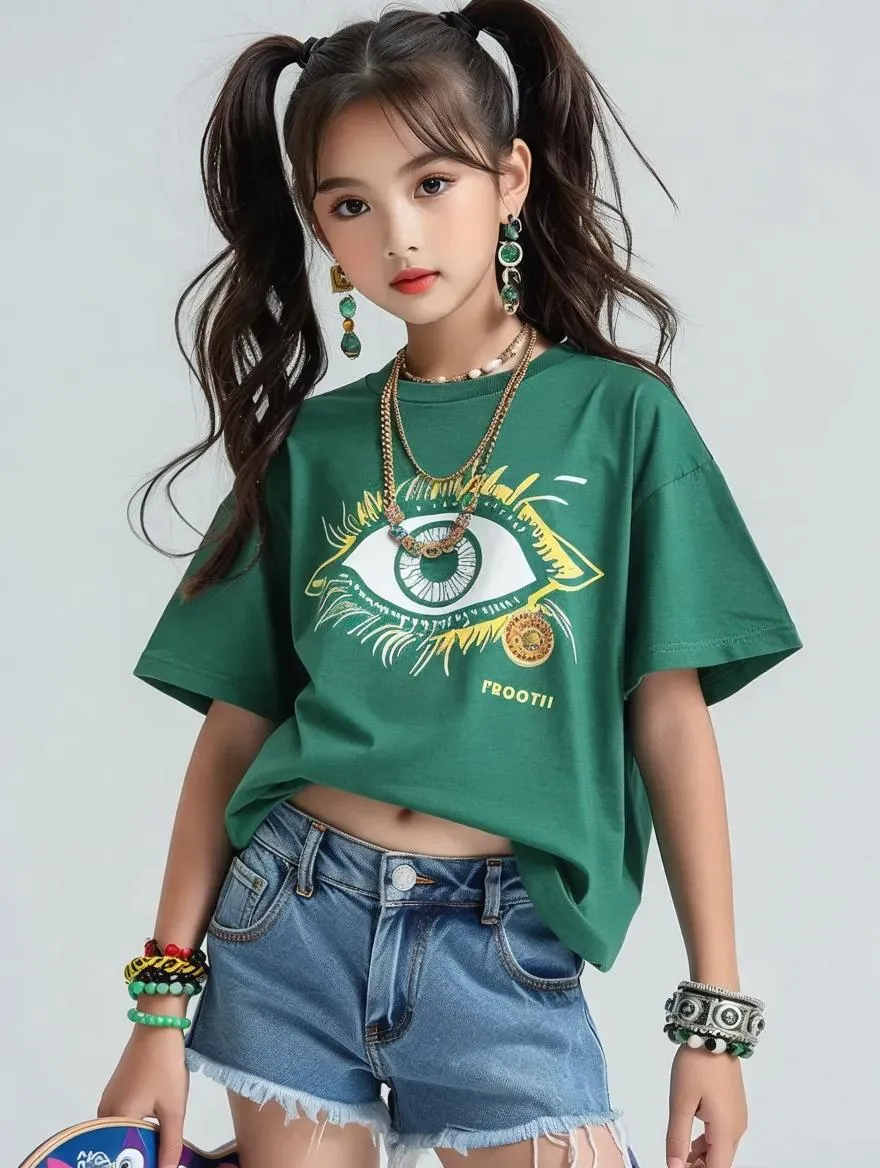 Generate a vibrant AI image of a youthful skateboarding girl with black ponytail hair, green print shirt, and denim shorts. Perfect for capturing dynamic motion, urban style, and playful energy. Ultra-detailed 8K quality, ideal for posters, social media, or creative projects requiring lively, high-resolution visuals of active children in casual settings.
