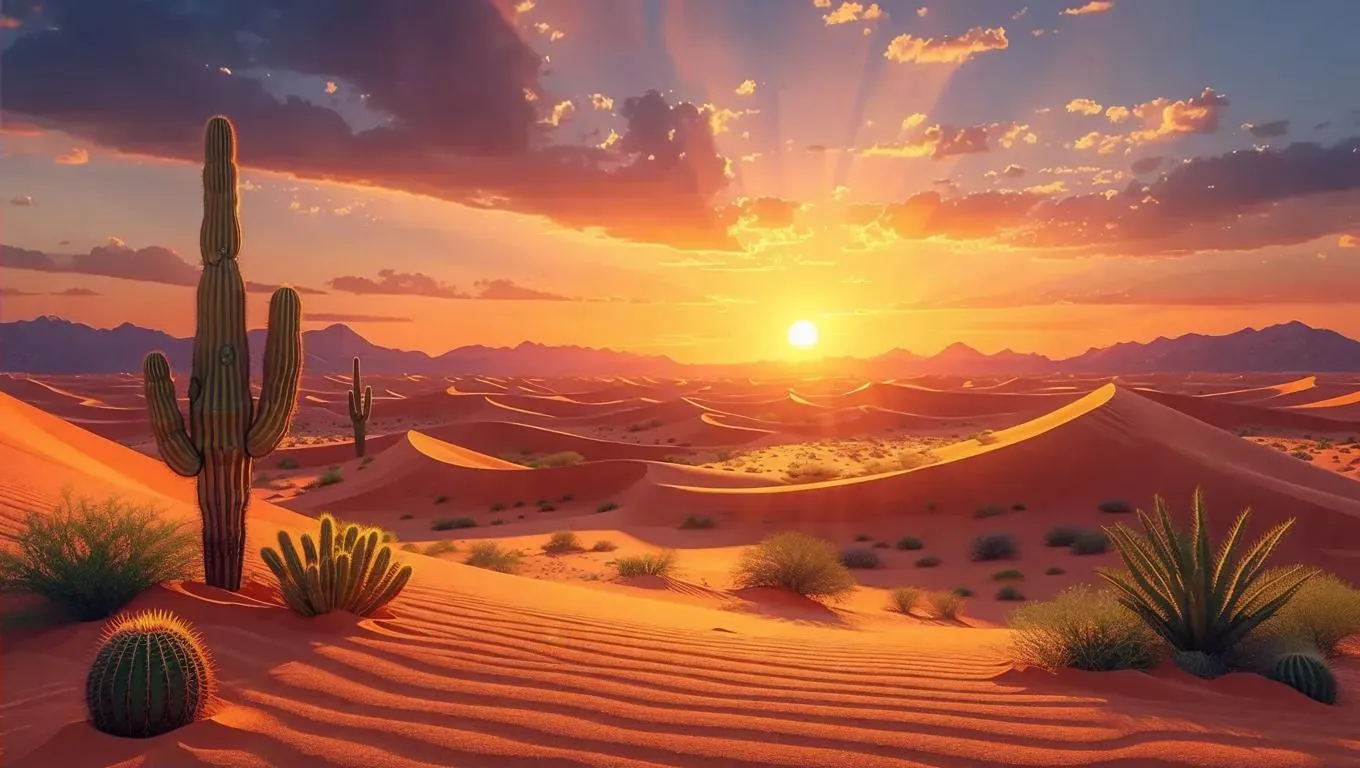 Create a vibrant AI-generated cartoon 3D desert sunrise scene with golden sand dunes, Disney-Pixar-style skies, and cacti. Perfect for dynamic shadows, vivid orange-purple gradients, and lifelike textures. Ideal for AI art, animation, or professional visuals blending fantasy and realism. Explore desert landscapes with AI effects for stunning, professional-grade imagery.