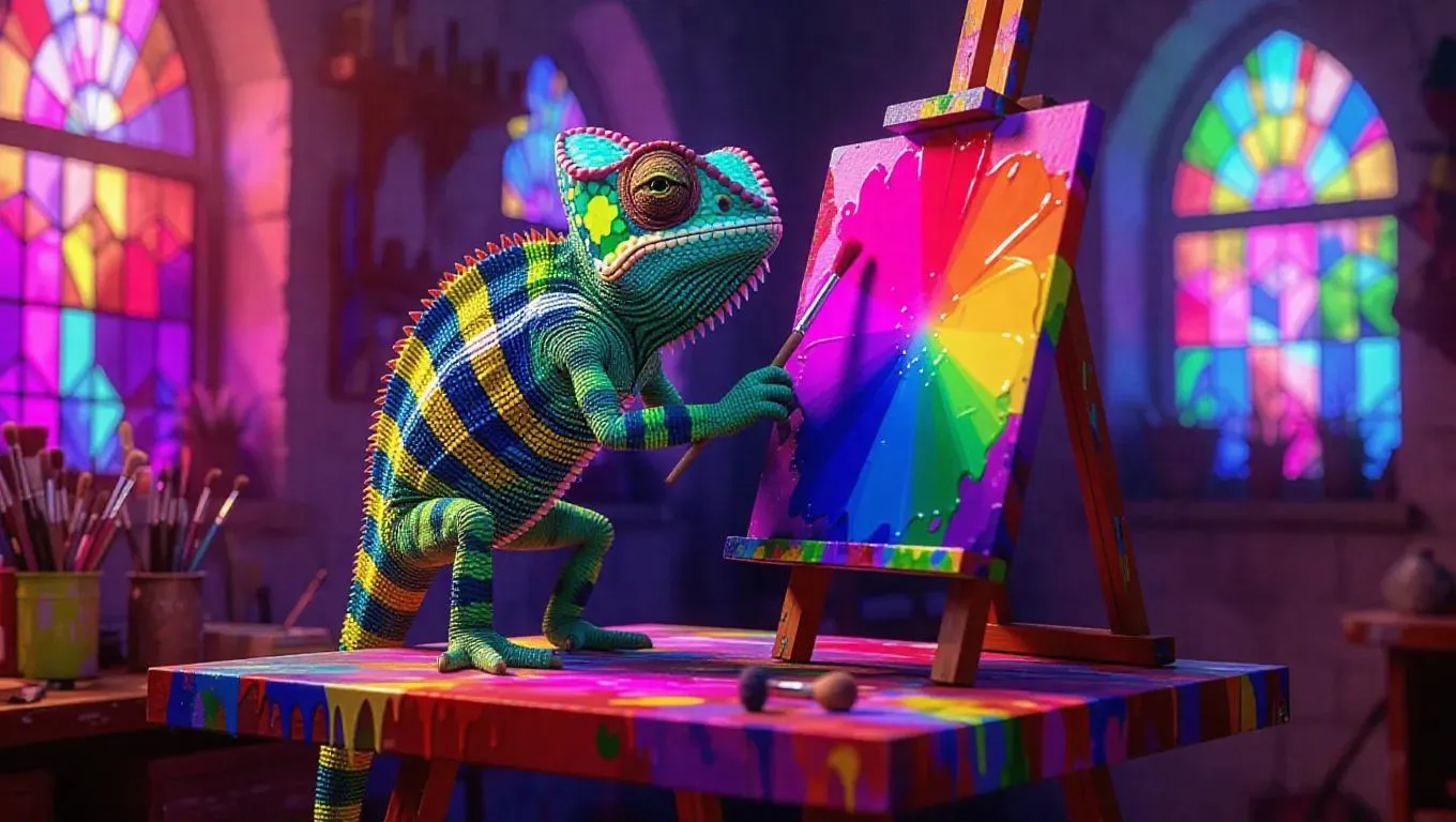 A cartoon chameleon artist painting itself in a rainbow of vibrant colors, perched on a paint-splattered easel in a whimsical art studio, surrounded by colorful palettes and brushes, with light streaming through stained glass windows, creating a magical atmosphere --ar 4:5 --raw --profile zxtlwze --stylize 750