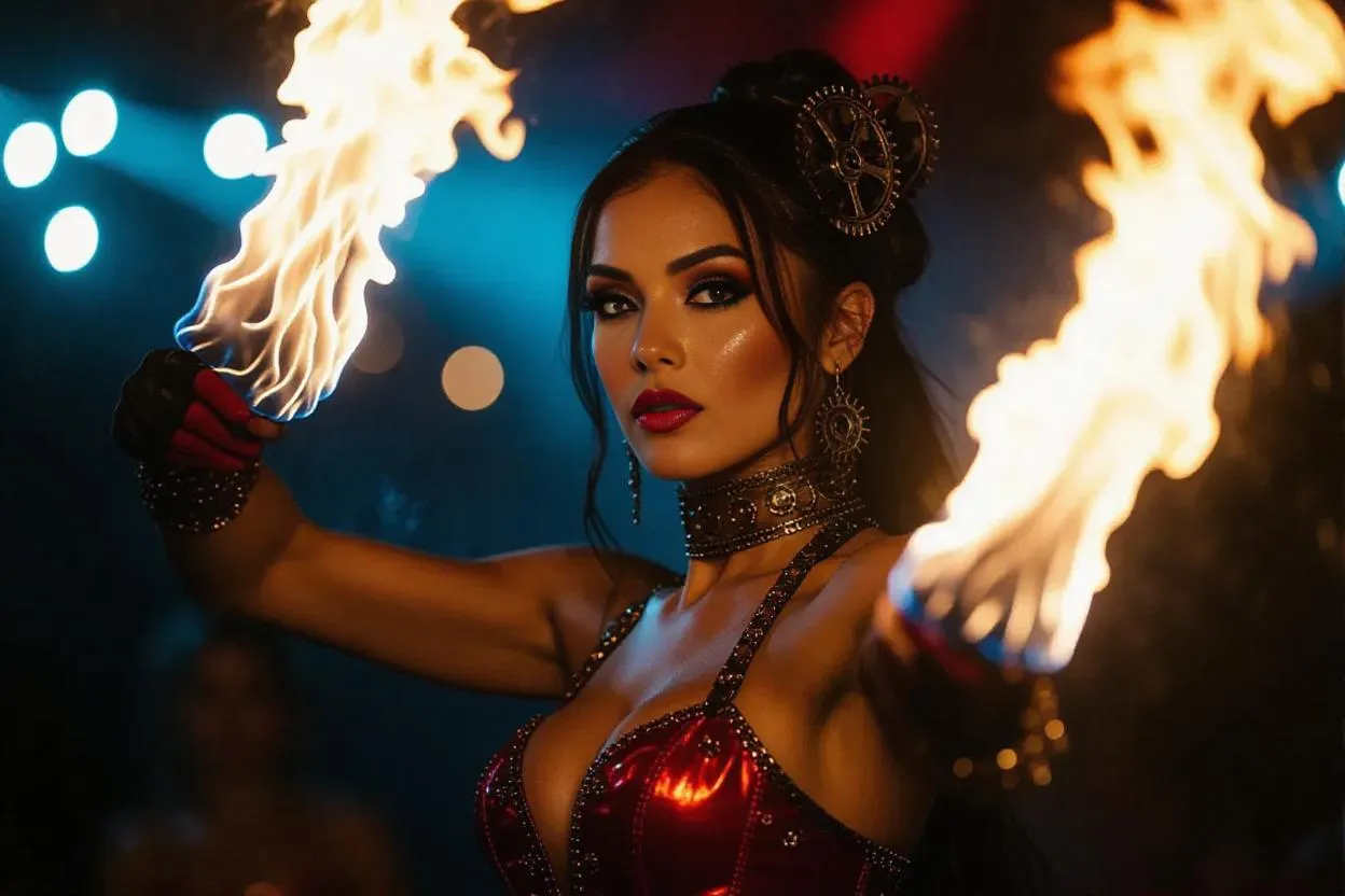 Vibrant AI-generated image of a beautiful Mexican woman in a fiery circus performance, blending steampunk elements like gears and brass accents. Dramatic high-contrast photography highlights her strength, elegance, and passion during a fire show. Perfect for artistic storytelling, creative visuals, and immersive AI-powered steampunk-inspired content.