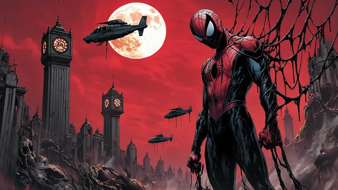 Generate AI horror art of symbiote Spider-Man as Goya's Saturn, consuming robotic clones in a nightmarish landscape. Vivago.ai transforms prompts into professional-grade visuals with bleeding-edge AI effects. Create melting web-clocktowers under blood moon skies with SHIELD helicarriers – perfect for dark superhero concept art and visual storytelling.