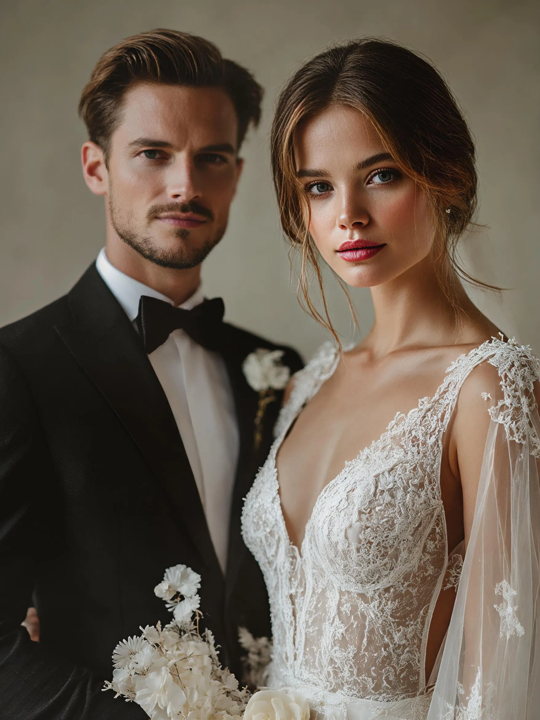 Transform casual photos into elegant wedding portraits with AI. Create realistic images of couples in modern lace wedding dresses and classic black tuxedos. Preserve natural faces, backgrounds, and cinematic lighting. Use Vivago.ai to effortlessly generate stunning, professional-grade wedding imagery. (Word Count: 40)