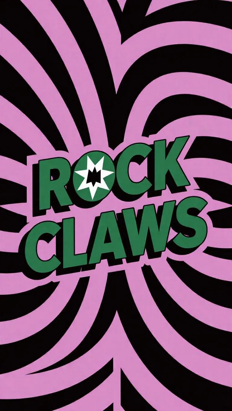 Design a minimalist "Rock Claws" graphic with 3D thin-outline letters in deep green, beige fill, and soft lilac shading. Neutral background features subtle diagonal lines for dynamic contrast, ideal for modern black tees. AI-generated sleek aesthetic balances boldness and understatement—perfect for edgy, contemporary apparel. Elevate streetwear with vivago.ai's precision tools.