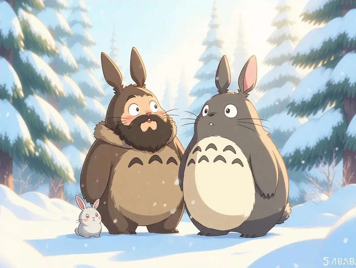 Create a whimsical Studio Ghibli-inspired anime illustration featuring a bearded man and kawaii rabbit in a snowy wonderland. Soft pastel gradients, expressive eyes, and rounded shapes evoke Totoro's charm with stylized trees, gentle lighting, and heartwarming joy. Ideal for AI-generated kawaii winter scenes blending innocence and Studio Ghibli aesthetic.