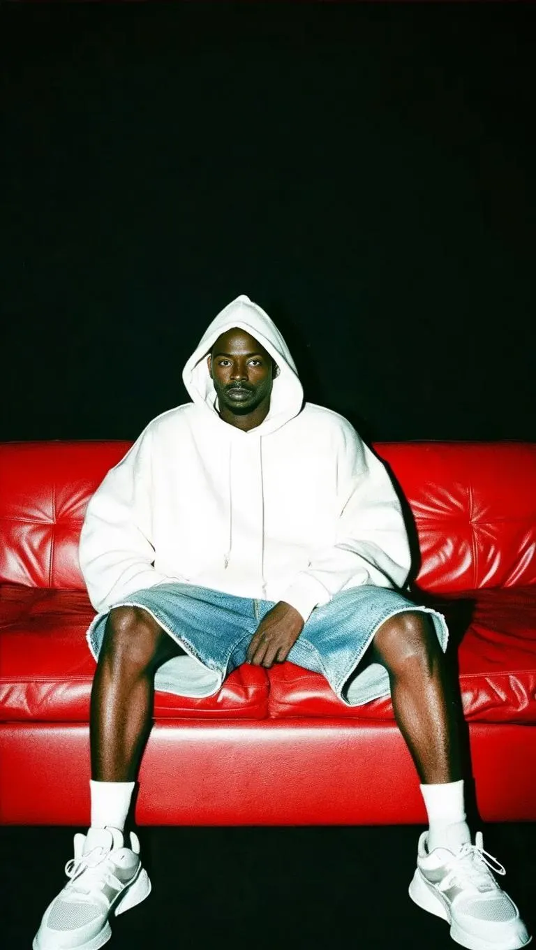 Generate striking AI visuals with vivago.ai's tools. Surreal image of a man dramatically sinking into a bold red leather couch, wearing oversized futurist streetwear – white hoodie, denim shorts, and sneakers. High-contrast black background enhances graphic intensity. Perfect for edgy digital art, fashion concepts, or avant-garde storytelling. AI-powered precision for professional surrealism. #VivagoAI