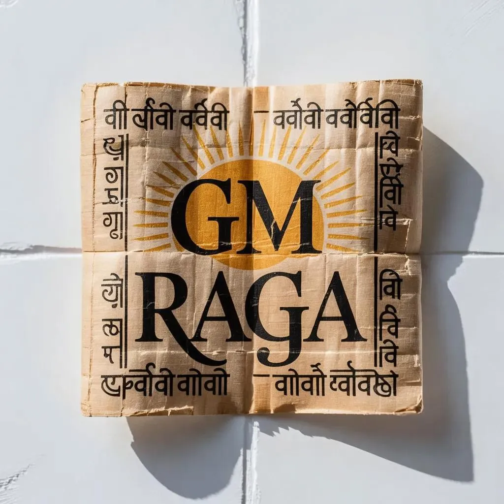 Create a custom Sanskrit-style "GM raga" square papyrus sticker with AI. Features sun motifs, spiritual symbolism, and crisp white backdrop. Perfect for yoga studios, spiritual gifts, or meditation spaces. Design cultural authenticity effortlessly using Vivago.ai's AI art tools for elegant, meaningful visual creations.