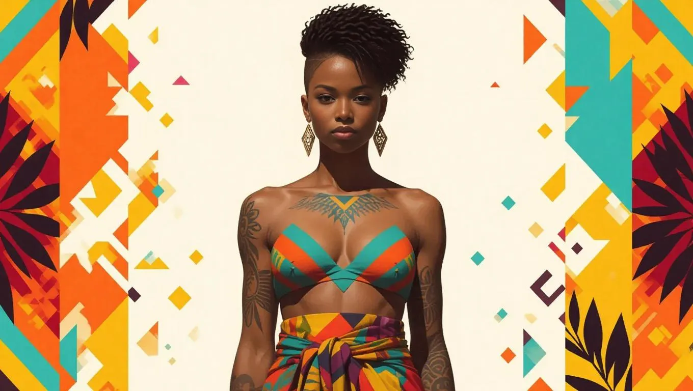 A 30-year-old black woman with short, textured hair and a bold, geometric tattoo on her chest, wearing a traditional loincloth wrapped around her hips, exuding confidence and poise. Inspired by the vibrant, earthy tones and stylized realism of Amy Sherald, Lynette Yiadom-Boakye, and Kehinde Wiley, with a blend of African and Afro-Caribbean cultural elements, rendered in a dynamic, high-contrast style with bold brushstrokes and intricate textures.