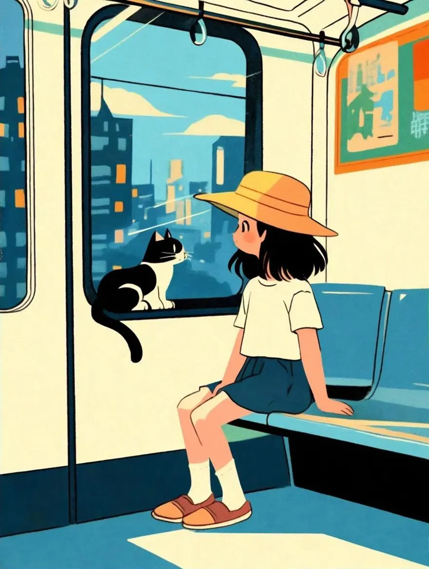 Create charming subway scenes with AI! Generate vibrant Ligne Claire-style cartoons featuring a girl in a hat, a cozy cat companion, and summer cityscapes through vivago.ai. Perfect blend of concise linework and warm colors for friendly, nostalgic visuals. Ideal for illustrators seeking AI-powered cartoon effects.