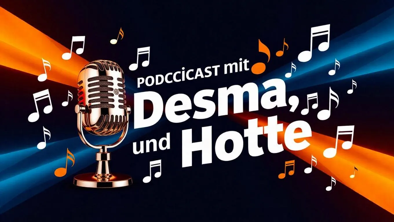 Create a dynamic YouTube banner for "Podcast mit Desma und Hotte" featuring a vibrant microphone, floating music notes, and gradient dark blue to orange backdrop. Bold modern typography highlights your channel name. AI-generated visuals for standout podcast branding at vivago.ai.