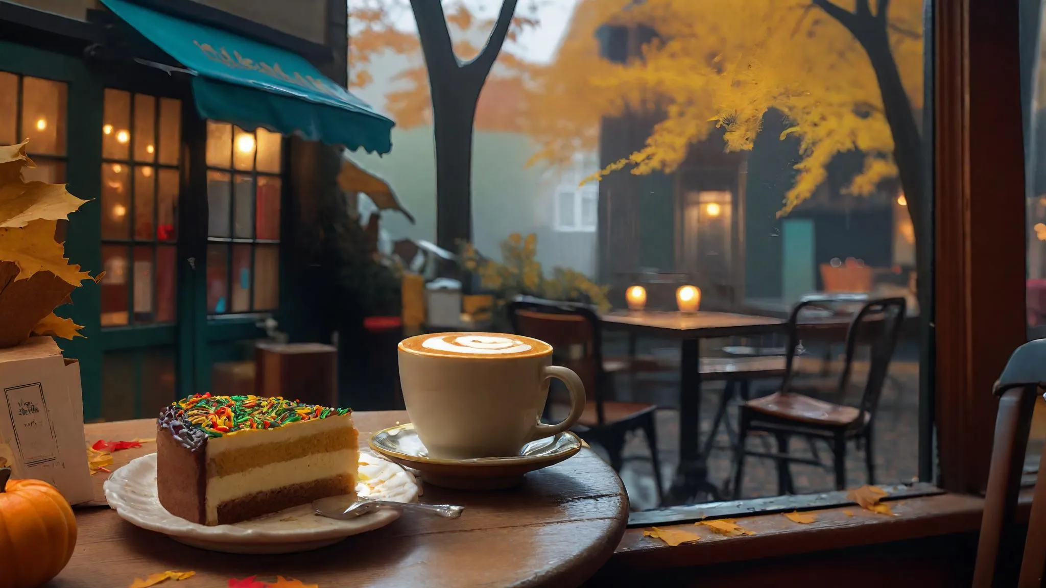 Generate a cozy European café scene with AI: steaming coffee, vintage wooden table, autumn ambiance, light rain, and charming street lamps. Perfect for evoking serene old-town vibes with overcast skies, golden foliage, and a quaint riverside view—crafted by VivaGo.ai's advanced AI image tools.