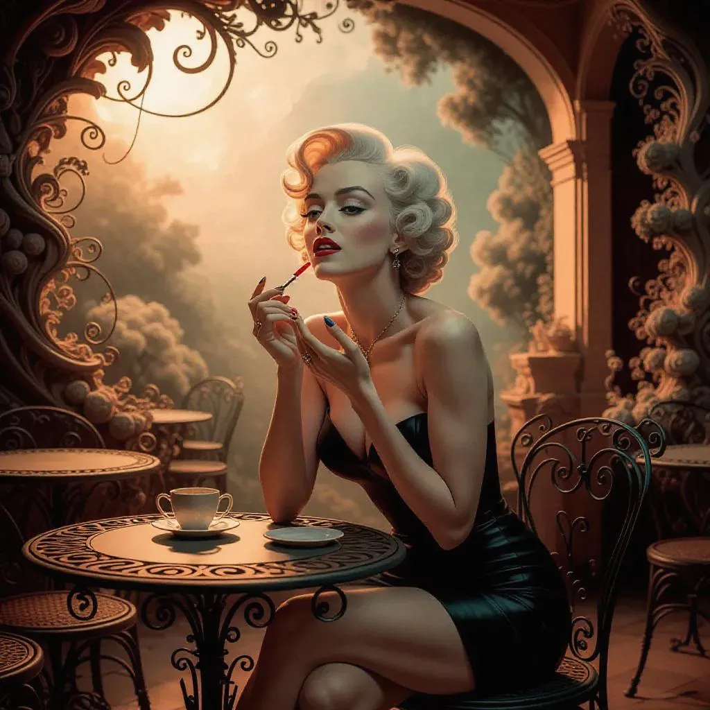 Generate a vivid impasto oil painting blending Alphonse Mucha, Jeremy Mann, and Heinrich Kley's styles, depicting Marilyn Monroe in an Italian café. Capture her "Teen Angst" posture mid-makeup with textured strokes, cosmic warm hues, and subtle anthropic decay. Inspired by Gammell, Goldin, and Gerome, soft lighting highlights emotional depth and ethereal beauty. Create AI-driven artistry with Vivago.ai's tools.