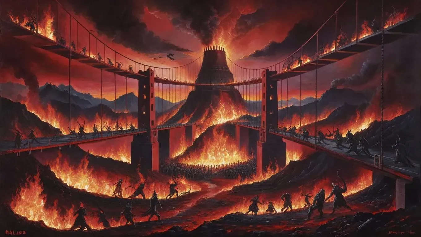 Create a hellish AI-generated oil painting with fiery red tones, dark ambiance, and suspension bridges leading to a blazing furnace. Populate eerie landscapes with demonic figures from a dramatic bird’s-eye view. Elevate projects using vivago.ai’s professional AI tools for striking, infernal visuals.