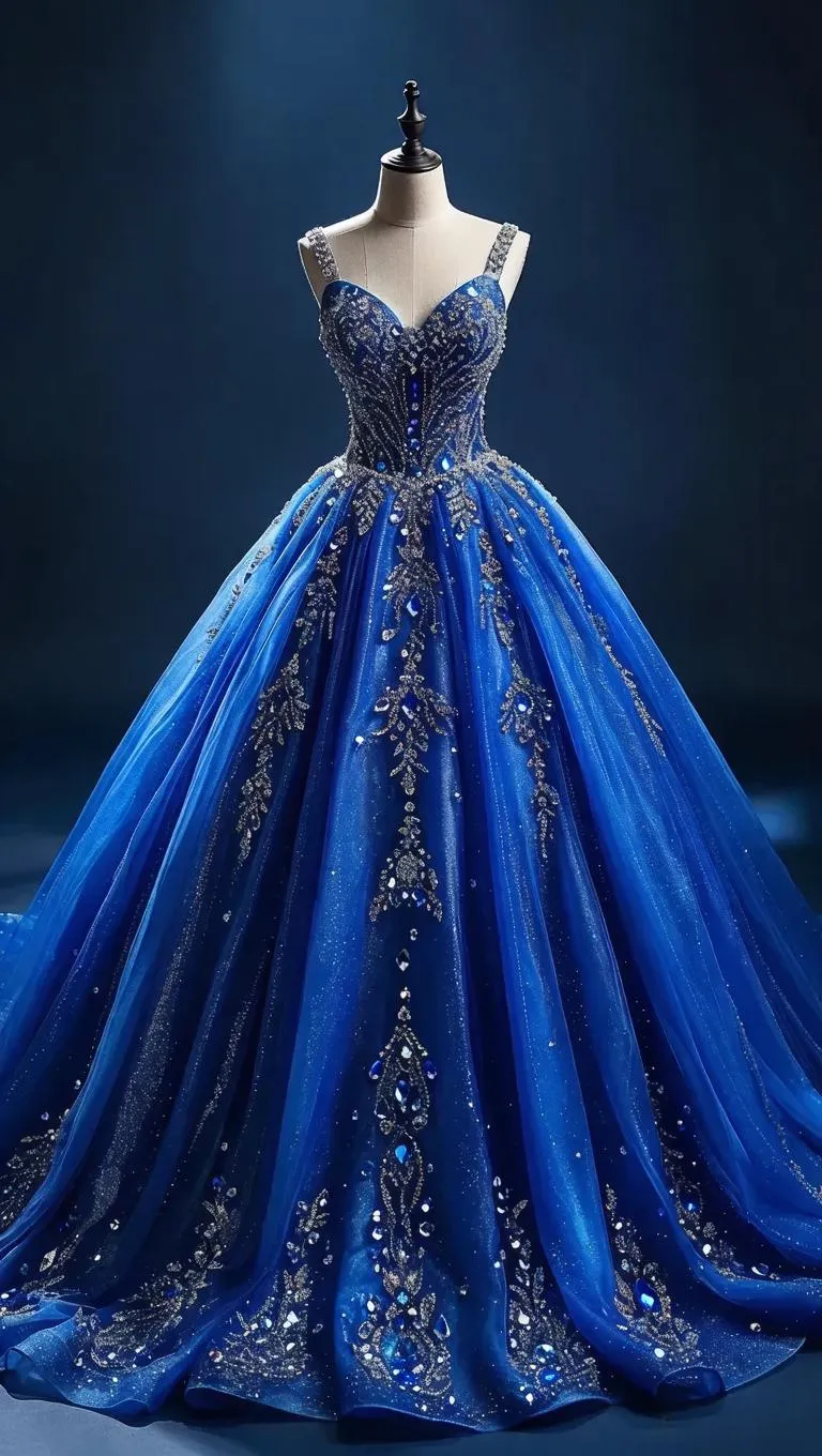 Generate a stunning AI-powered blue crystal dress design with intricate details on a plain backdrop. Perfect for fashion inspiration, this sparkling ensemble highlights vibrant hues and professional-grade visuals. Ideal for creators seeking elegant, high-quality AI-generated fashion imagery using VivaGo.ai.