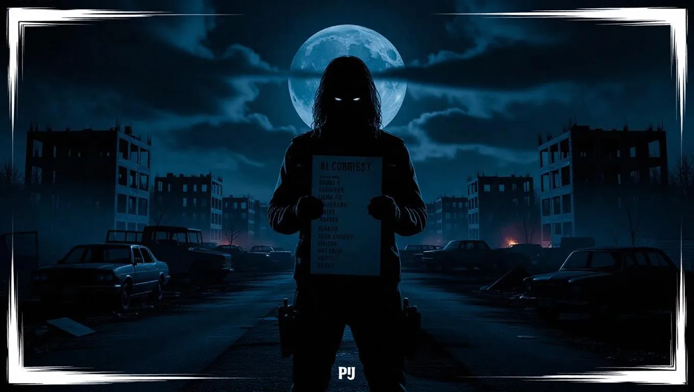 Desolate war-torn urban landscape under a menacing moonlit sky, AI-generated gritty realism meets eerie surrealism. A lone vengeful figure with glowing eyes holds names amid broken buildings, radar pulses, and Jersey Club-Dark Drill intensity. Craft haunting, high-contrast visuals with Vivago.ai's AI art tools for aggressive, cold atmospheres. Ideal for dark music visuals and Psy Ops-inspired storytelling.