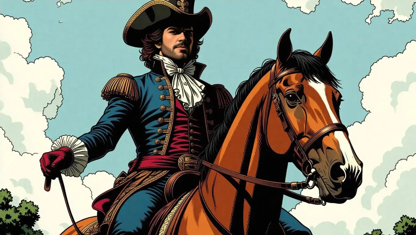 A man wearing a baroque outfit and a baroque wig is riding a horse. comic book style
