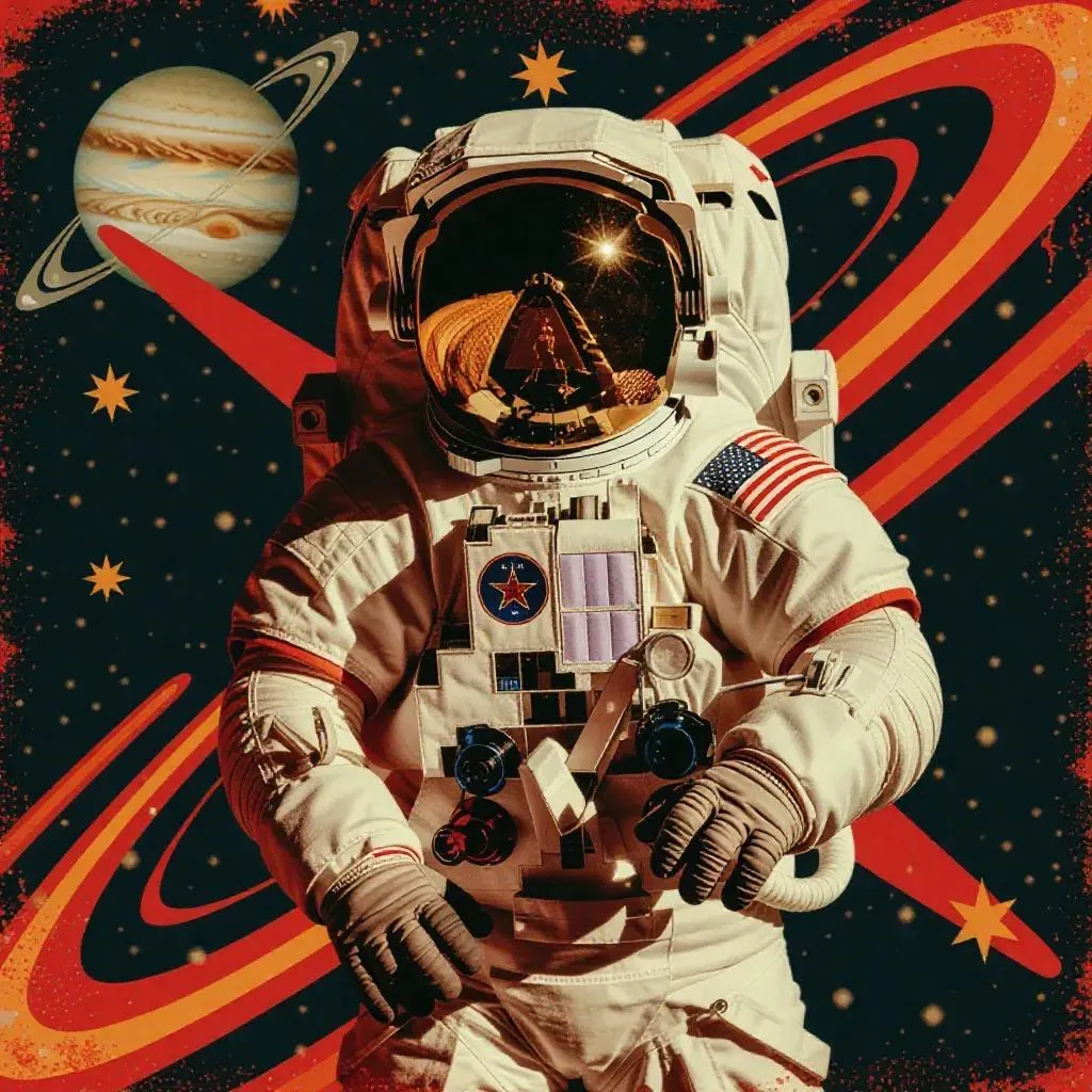 Generate 1950s sci-fi nostalgia with AI: retro space art blending Soviet symbols, astronauts, and celestial collage. vivago.ai crafts vintage-inspired visuals using retro palettes, orbital motifs, and space-age aesthetics. Perfect for nostalgic space age imagery, AI-powered creative tools, and retro-futuristic designs.
