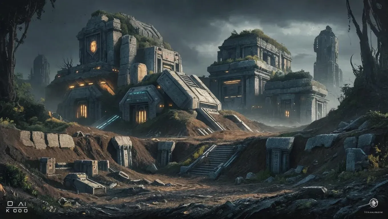 Explore apocalyptic landscapes where giant futuristic machines emerge from centuries-old earth, blending ancient stone structures with advanced technology. Witness ultrarealistic AI-generated scenes of overgrown ruins, glowing artifacts, and towering relics of a lost civilization. Transform your visions into vivid imagery with cutting-edge AI creativity.