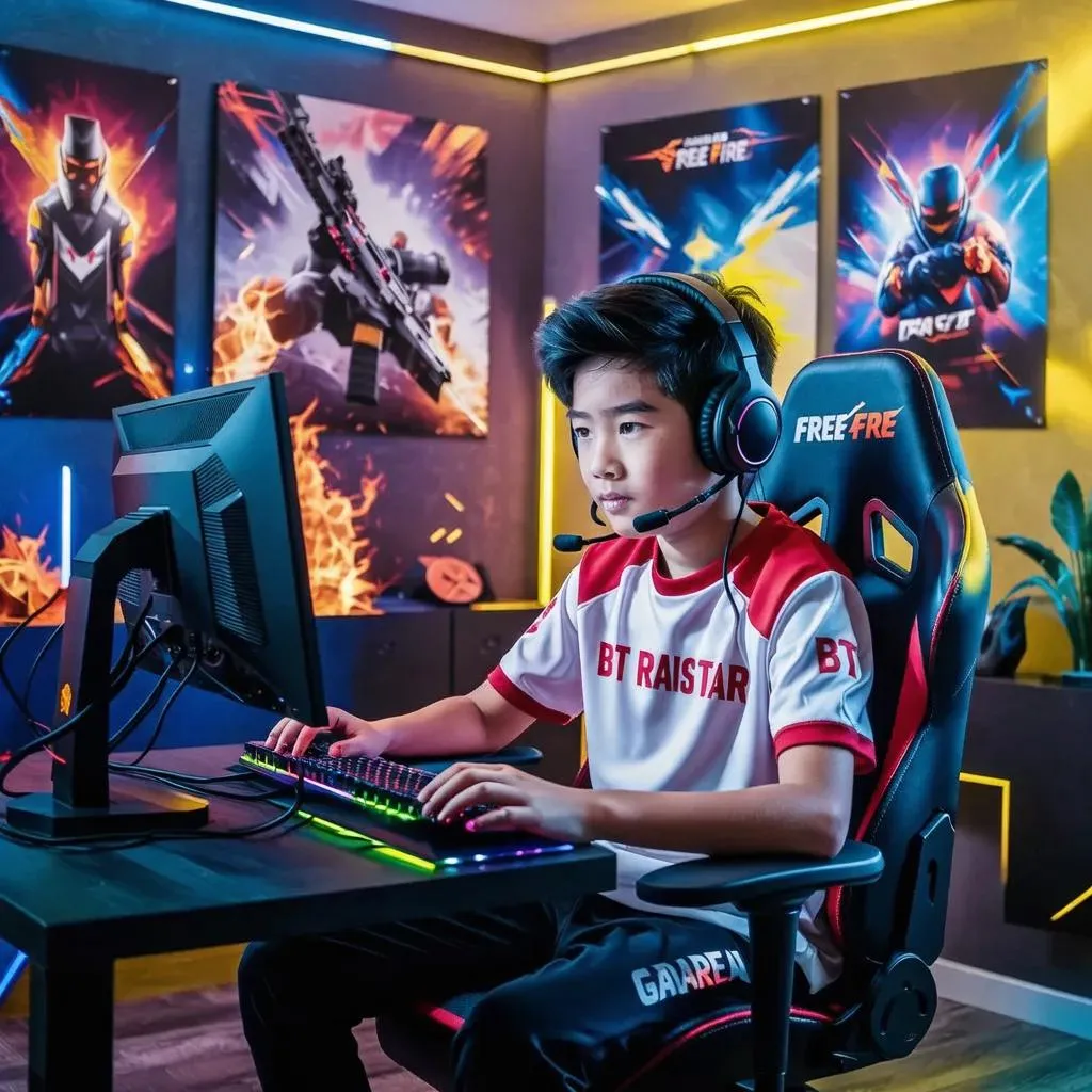 Vibrant gaming setup with blue-yellow LED lights energizes a boy playing Garena Free Fire on PC. Stylish gaming chair, "BT Raisar"-branded shirt, headphones, and dynamic monitor immerse him in intense gameplay. Neon-lit desk and colorful posters amplify the room's electrifying esports atmosphere for immersive, professional-grade AI-generated gaming visuals.