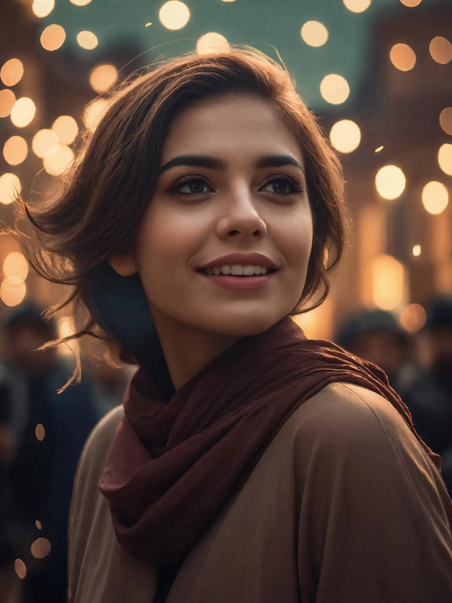 Generate lifelike AI portraits of a happy girl with a natural smile and medium hair, set in an urban scene with muted tones. vivago.ai's advanced AI tools create realistic, thoughtful portraits effortlessly. Perfect for professional-grade results in image generation.