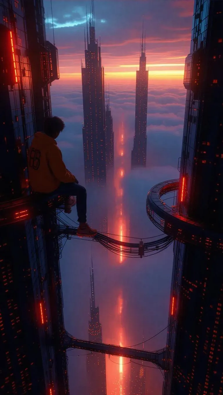 A sprawling futuristic metropolis suspended 100km above clouded Earth, its skyscrapers carved from futuristic material with iridescent nebula shimmering through their translucent structures. A lone youth perches on a dizzying ledge of the tallest tower, sneakers scraping vapor as they lean over to glimpse the distant planetary curve below, the swirling galaxies beyond. Neon-lit sky bridges pulse with levitating transports. The city thrums with energy