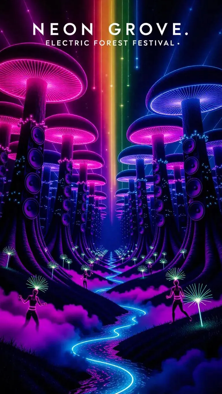Immerse in a pulsating AI-generated neon forest with bioluminescent mushrooms, crystalline speakers, and electric rivers. Experience vibrant music visualizations, spectral fireworks, and neon dancers surfing bass waves—surreal, psychedelic effects for electrifying festival backdrops.