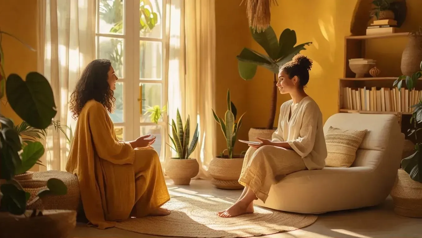 Generate AI-powered therapy session visuals with a professional therapist and young adult in a calming beige-yellow setting. Transform text prompts into empathetic, supportive environments using vivago.ai's advanced image tools for realistic mental health and wellness-focused scenes.