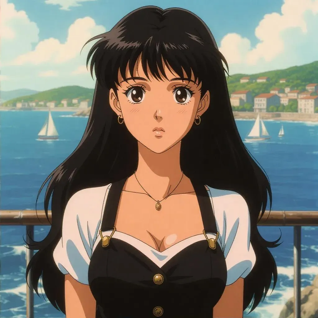 Generate stunning 1980s anime-style visuals with vivago.ai's AI tools. Create a black-haired Barbie-like character in Hayao Miyazaki's aesthetic, set against a seaside city backdrop. Explore intricate aristocratic details, intense close-ups, and iconic pop culture references. Perfect for UHD image quality and vivid animated GIFs with a nostalgic, simple background.