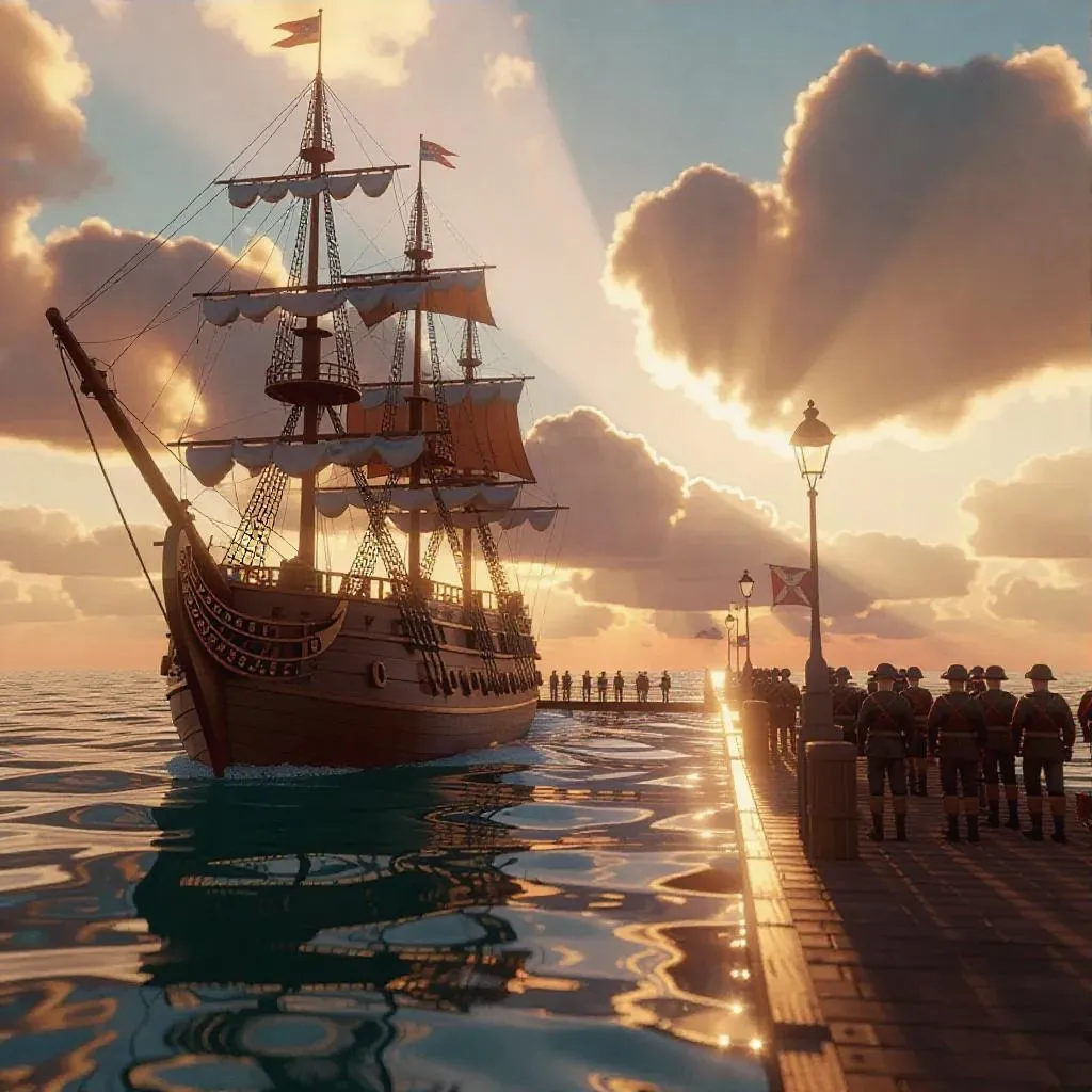 Transform text into vibrant 3D cartoon visuals with vivago.ai's AI image generator. Create a nostalgic scene of a vintage wooden ship at the port, soldiers waiting under sun beams casting shadows, and a twinkling sea. Elevate your creative projects with professional-grade AI-generated art and effects.