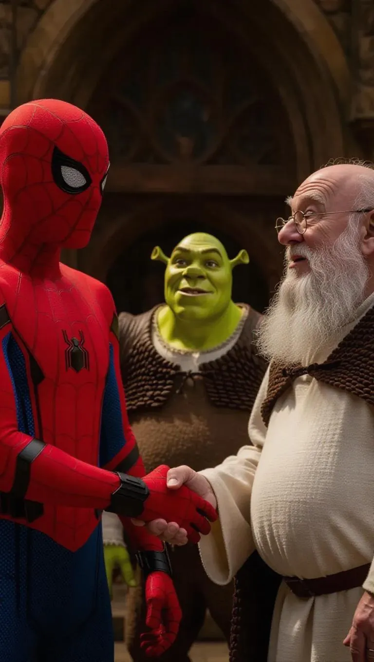 Spiderman, in his iconic red and blue suit, shakes hands with Dumbledore, who quietly nods with a small, knowing grin. Shrek stands in the background, looking bemused, adding a touch of whimsical humor to the scene.