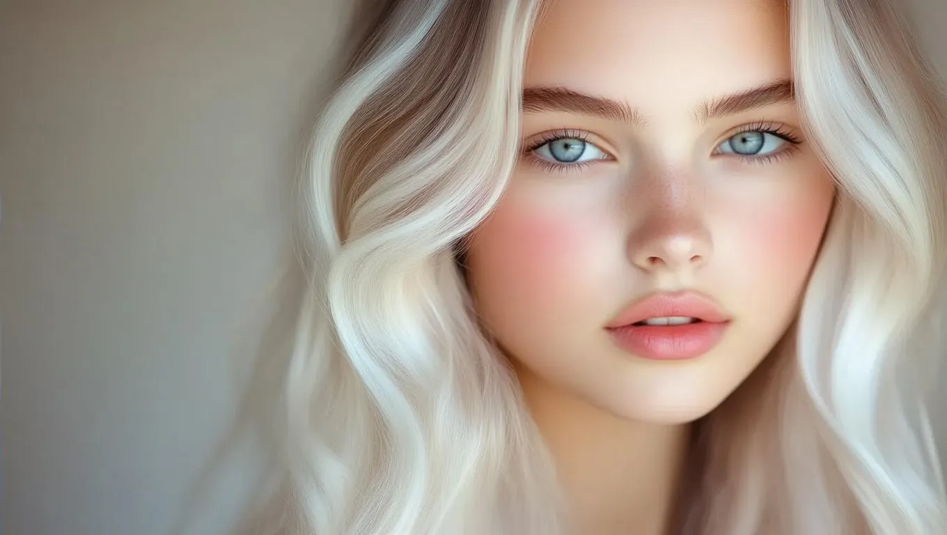 Vivid AI-generated portrait of a youthful 16-year-old with striking bicolor hair: light brown waves accented by bold white streaks framing her face. Features light beige skin, captivating deep blue eyes, and soft pink lips. Perfect for character design inspiration or fantasy visuals, showcasing detailed AI artistry in capturing teenage features and unique hair contrast.