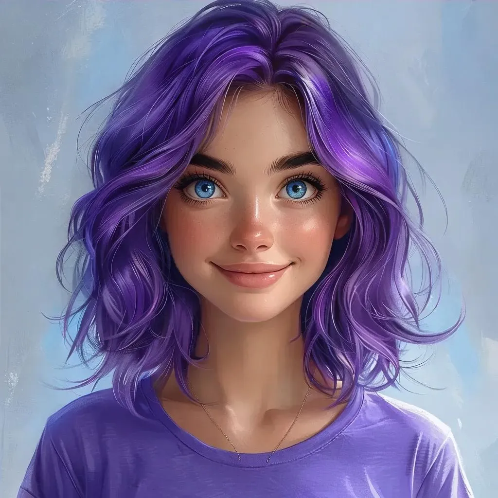 Design a vibrant AI-generated character with purple hair, blue eyes, and a T-shirt. Choose between round or square face shapes and a cheerful expression. Explore customizable features for unique character creation with Vivago.ai's advanced AI tools. Bring your creative vision to life with professional-grade AI effects.