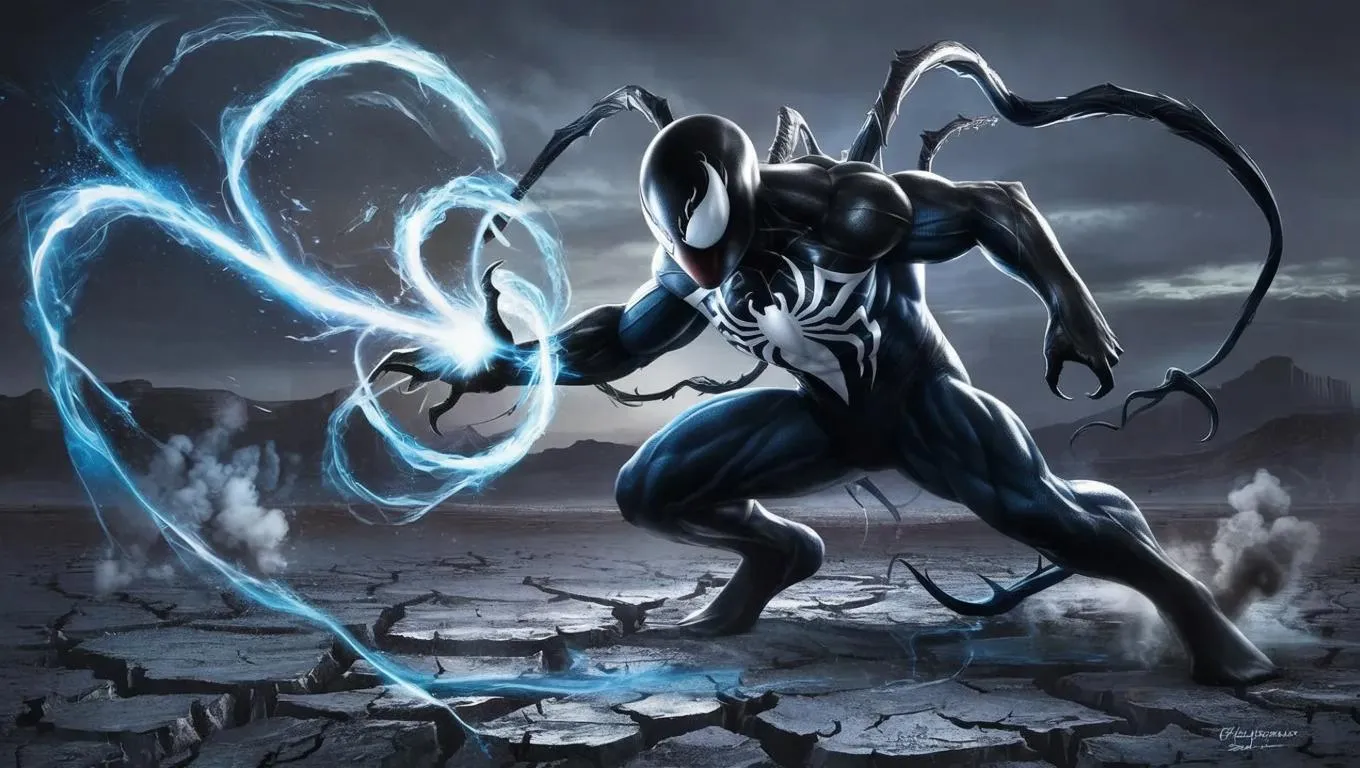 Dramatic AI-generated image of a symbiote struck by a glowing blue energy blast, showcasing dynamic character design with sleek black form, white veining, and shockwave effects. Features intense energy impact, floating tendrils, and barren cracked landscape backdrop. Perfect for sci-fi battle artwork and supernatural creature concepts. Create with VivaGo.ai.