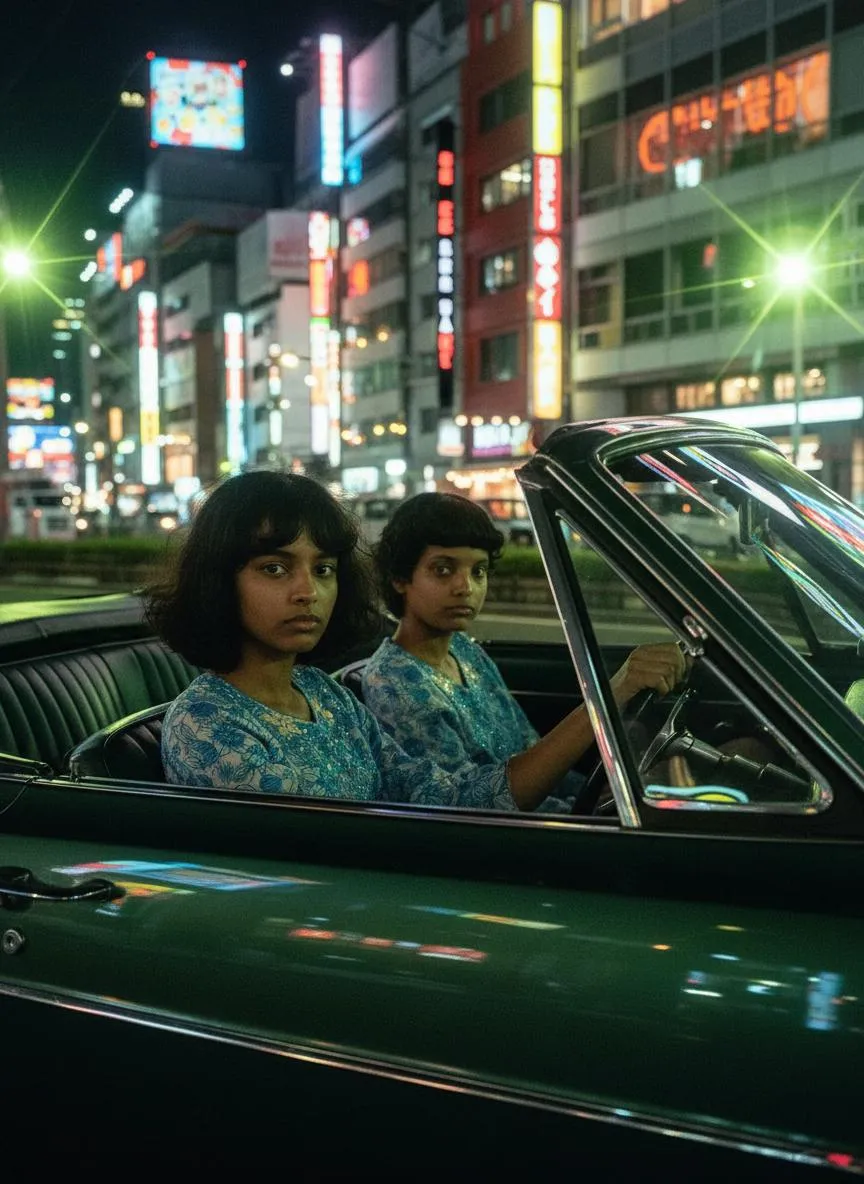 Generate vintage AI images with vivago.ai: Tokyo night scene in a retro green convertible. Driver and passenger close-up under neon lights. 2000s subculture style with low-saturation film filter, dramatic yellow-green contrast, and lens flares. Professional magazine portrait effect captures chrome reflections and flowing hair. AI-powered visual creation for cinematic car aesthetics.