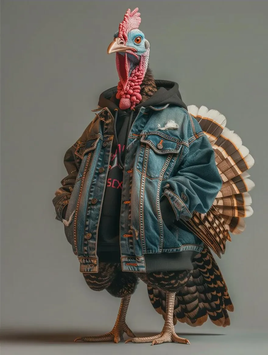 Anthropomorphic turkeys standing on two legs wearing streetwear clothes, full-length head-to-toe shot, neutral background. Hyperrealistic style