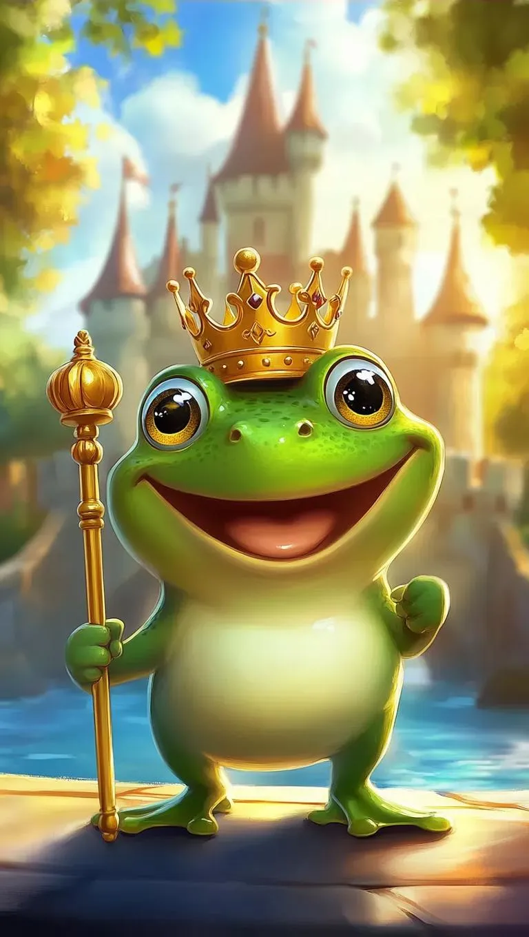 Create a whimsical AI-generated fantasy scene featuring a cute frog prince with a tiny crown and scepter in a vibrant waterpark. VivaGO.ai transforms text prompts into happy, painted-texture anthropomorphic art with professional-grade AI effects for enchanting fairy tale visuals.