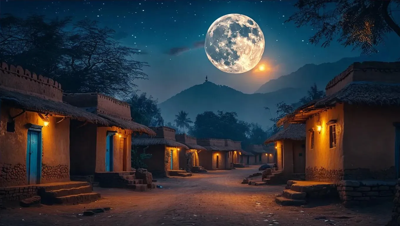 Generate a stunning 4K HD AI image of a serene Indian village at night, illuminated by a glowing moon. Capture traditional huts, glowing lanterns, and moonlit landscapes with Vivago.ai's advanced AI tools for vivid, professional-grade nighttime scenery and cultural ambiance.