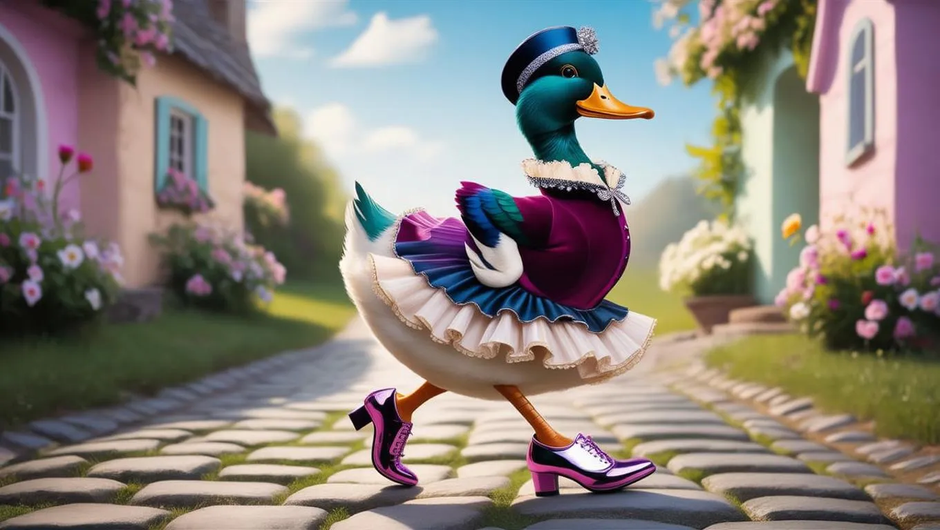 Generate a whimsical duck wearing a stylish dress and shoe with VividGo.ai's AI image generator. Create charming anthropomorphic animal art using advanced creative tools for unique, eye-catching visuals.