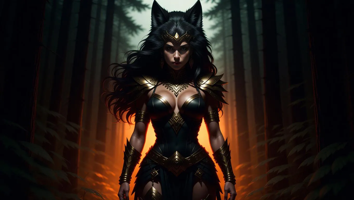Digital illustration of a female warrior standing in a dark and eerie forest, wearing a black and gold outfit with a large headdress resembling a wolf’s head, made of flowing hair styled like a wolf. She wears a necklace and bracelets, with a fierce expression, body slightly turned. Tall trees and dense foliage surround her, with a distant orange glow adding to the dark, mysterious mood.
