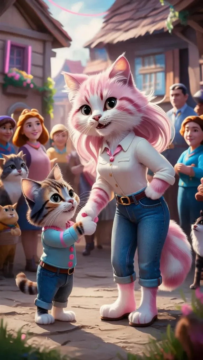 Generate AI-powered visuals of a minister shaking hands with a stylish anthropomorphic cat (pastel pink/white fur, chic outfit) in a village scene. Features neon cold lighting, expressive characters, and villagers/animals watching. Transform prompts into professional cartoon-style art with vivago.ai’s realistic AI effects and editing tools.