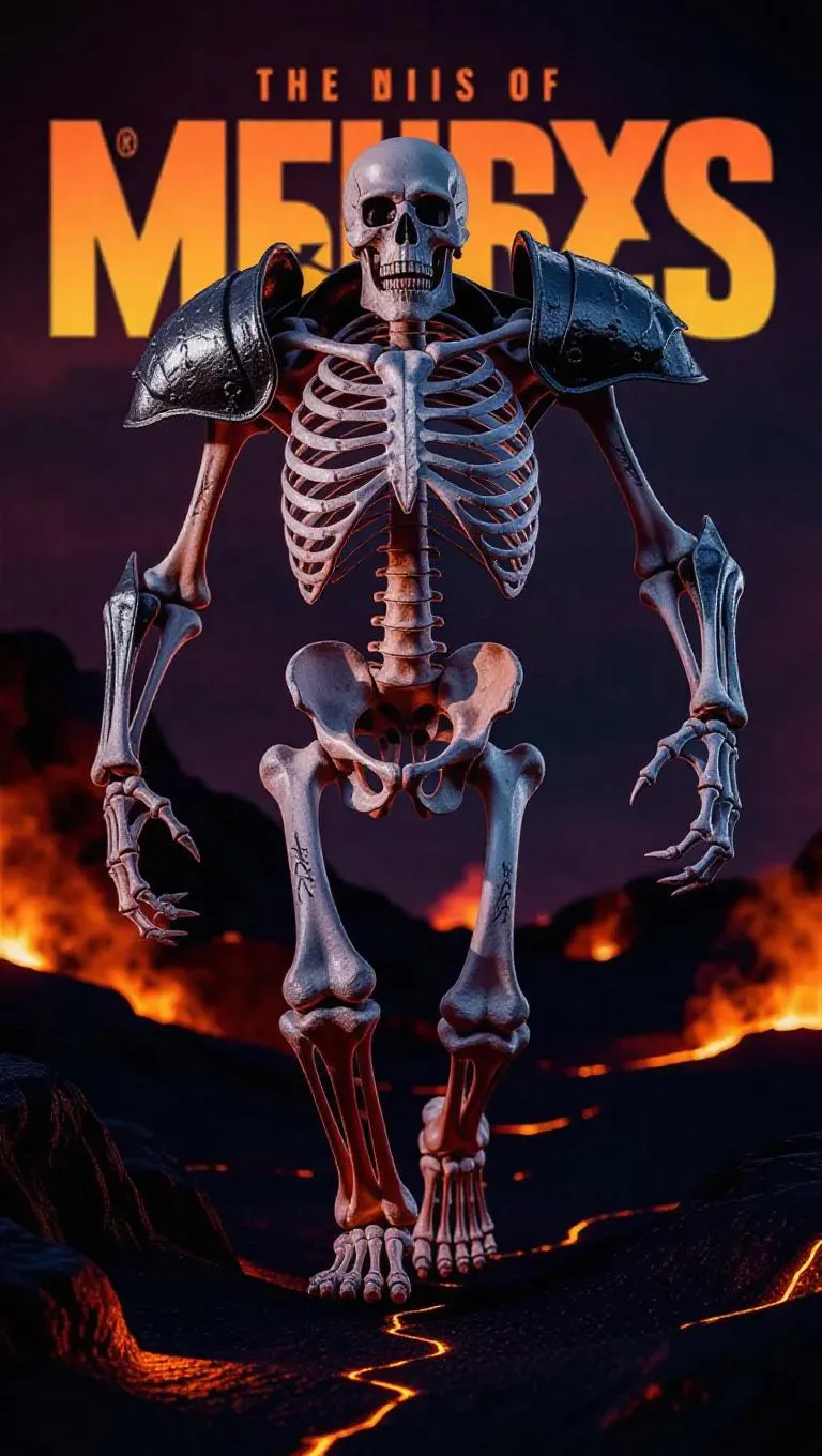 A colossal skeletal warrior strides through volcanic badlands, its fossilized frame swollen with ossified musculature - ribcage arches thick as cathedral buttresses, femur shafts bulging with calcified tendons that twist like steel cables around marrow-glowing joints. Bioluminescent synovial fluid pulses through translucent cartilage-veins, illuminating striations in the knotted 'bone-flesh' where fossil records of ancient battles appear as growth rings. The creature's scapulae flare like tarnished silver pauldrons fused with obsidian bone spurs, while its vertebrae stack in piston-like segments that hiss steam with each earth-shaking step. Hyper-detailed close-up on the left forearm: knobby phalanges merge into a spiked cestus where knuckles distend into magma-cracked mace heads, pressurized marrow glowing angry orange between tectonic plate-like metacarpals. The background reveals a ruined coliseum being crushed beneath the warrior's foot, limestone columns snapping against its weight-bearing tibia swollen like a hydraulic press. Volumetric ash-storm lighting with amber highlights catching the sweat-like mineral deposits weeping from overdeveloped bone pores.