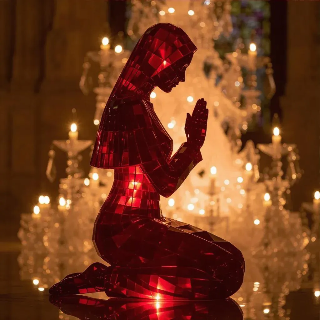 AI-generated ruby crystal sculpture of a kneeling woman in prayer, radiating elegance and spiritual devotion. Serene evening atmosphere enhances the mystical glow of sparkling gemstone artwork. Experience tranquil, AI-crafted spiritual art with intricate crystal details and ethereal reverence.