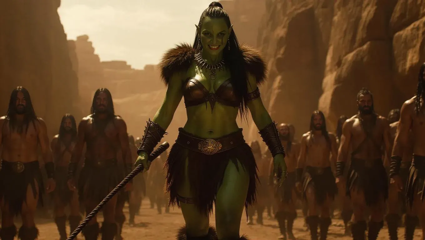 Create AI-generated game-style visuals of a fierce female orc warrior dominating an ancient quarry at dusk. Craft detailed fantasy scenes with muscular green-skinned characters, enslaved laborers in chains, and rugged mining gear. Perfect for dark fantasy RPGs or concept art - generate armored orcs, glowing dusk lighting, and gritty textures using Vivago.ai's AI image tools.