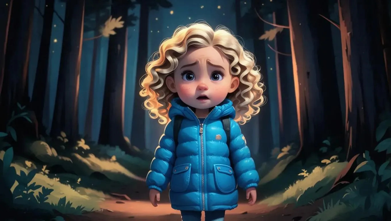Generate a Pixar-style animated scene of an anxious 3-year-old girl with curly blonde hair in blue winter clothes, wandering a mystical dark forest at night. AI transforms this prompt into vivid childhood wonder with cinematic lighting and emotional depth, perfect for storytelling visuals or fantasy-themed AI art projects.