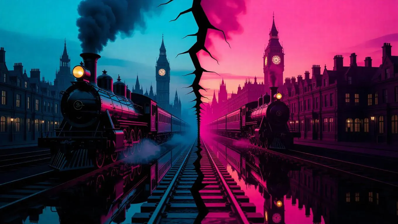 Dimensions crack, revealing the world of 2025 parallel with the past, a surreal blend of futuristic cities and vintage landscapes, with neon lights and steam engines coexisting, creating a vivid contrast between eras.